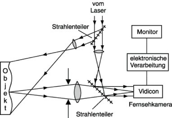 Speckle-Interferometrie. Dabei wird dem vom Objekt erzeugten stochastischen Felde ein deterministisches oder ein ebenfalls stochastisches Referenzwellenfeld überlagert. Es besteht eine starke Analogie zur Hologramminterferometrie. Technisch besonders bedeutsam ist die "elektronische Speckle-Interferometrie" (ESPI). Dabei wird mit einer hochauflösenden Fernsehkamera (Abb. 5) das Speckle-Feld des Objektes mit einer angepaßten Referenzwelle auf der Photokathode des Vidikons überlagert. Durch geeignete Wahl der Öffnungsblende wird das Speckle-Korn so groß gemacht, daß das S. örtlich aufgelöst werden kann. Das von der Kamera gelieferte elektrische Signal läßt sich speichern und mit Signalen von Folgezuständen subtraktiv oder multiplikativ überlagern. Auf diese Weise sind zeitgemittelte und Doppelexpositionsaufnahmen möglich. Von Vorteil ist das Fehlen chemischer Zwischenschritte. Nachteilig ist die begrenzte laterale und Tiefenauflösung.