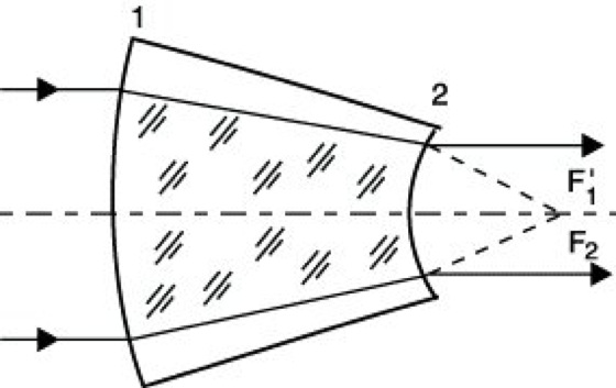 Steinheilscher Glaskonus: Der bildseitige Brennpunkt F'1 der Fläche 1 und der objektseitige Brennpunkt F2 der Fläche 2 fallen zusammen.