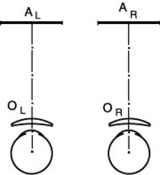 Stereowiedergabegeräte: Stereoaufnahmen können direkt oder in Projektion betrachtet werden. Für einen naturgetreuen Raumeindruck ist es erforderlich, daß das Perspektivitätszentrum bei der Wiedergabe demjenigen bei der Aufnahme entspricht. Die Betrachtung von Aufsichtsbildern und Diapositiven erfolgt in bequemer Weise mit einem Stereoskop. Linsenstereoskope besitzen zwei im Augenabstand angeordnete Sammellinsen OL und OR, in deren Brennpunkten die beiden zu betrachtenden Halbbilder AL und AR stehen. Diese Vorlagen werden ins Unendliche abgebildet, und die Blicklinien der Augen können bei unendlicher Akkomodation leicht parallel gerichtet werden (Abb.). Mit einfachen Linsenstereoskopen ist die Betrachtung von Stereobildpaaren bis zum Format 60 mm×130 mm möglich (Einzelbild maximal 60 mm breit). Größere Stereobildpaare (z.B. für Luftbildinterpretation) lassen sich mit dem Spiegelstereoskop auswerten.