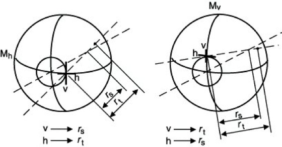 Topometrie: Sagittal- und Tangentialradien einer Hornhautvorderfläche. Mh horizontaler Meridian, Mv vertikaler Meridian, rs Sagittalradius, rt Meridionalradius, v vertikal, h horizontal.
