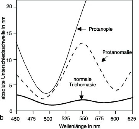 Unterschiedsschwelle: Unterschiedsschwelle bezüglich der Leuchtdichte (a) und der Wellenlänge (b). L Umfeldleuchtdichte (in cd/m2), ΔL/L minimaler relativer Leuchtdichteunterschied, der für die Erkennung benötigt wird.