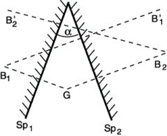 entstehen. Diese durch zweimalige Spiegelung hervorgerufenen virtuellen Bilder sind seitenrichtig. Ist α=90°, so fallen B ![]()
