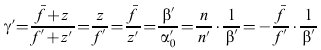 , den Brennpunktsabständen z' und z der Achsenschnittpunkte des Strahls, den Brechzahlen n' und n sowie dem lateralen und differentiellen Tiefenabbildungsmaßstab β' und α'0 (Abbildungsmaßstab) durch die Relation