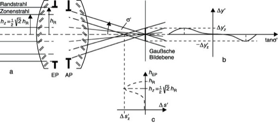 Zonenfehler: Sphärischer Zonenfehler. a) Strahlengang, b) Queraberration Δy', c) Längsaberration Δs'. EP Eintritts- und AP Austrittspupille.