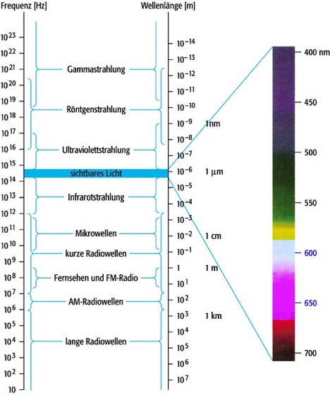 Elektrodynamik: Spektrum elektromagnetischer Wellen. Der sichtbare Teil ist zur Verdeutlichung rechts herausvergrößert.