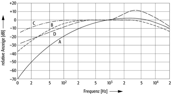 A-Bewertung: Übertragungskurven der Bewertungsfilter A, B, C und D.