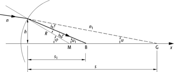 Abbesche Invariante: Für achsennahe Strahlen gilt: tanu = u = h/s, tanu1 = u1 = h/s1, sinϕ = ϕ = h/R, sinie/sinib = ie/ib = n1/n. Mit ie = ϕu und ib = ϕu1 ergibt sich