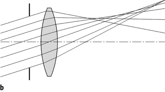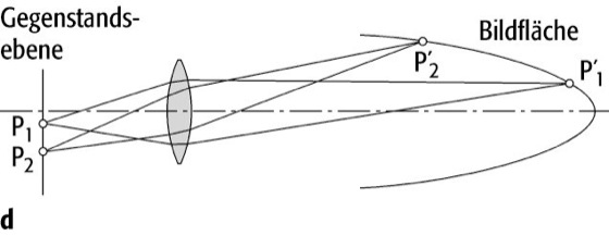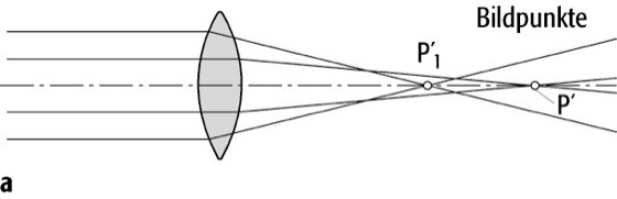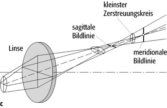 Sind die Winkel genügend klein, wie es bei den paraxialen Strahlen der Fall ist, so gibt es keine Abbildungsfehler, und die Abbildung ist ideal. Tragen aber auch Strahlen vom Rand einer Linse zu einem Bild bei, so lassen sich die Terme höherer Ordnung nicht mehr vernachlässigen. Als Abbildungsfehler dritter Ordnung bezeichnet man die folgenden Bildfehler: Öffnungsfehler (sphärische Aberration), Koma, Astigmatismus (Zweischalenfehler), Bildfeldwölbung und Verzeichnung (Abb.). Sie wurden zuerst von L. Seidel in der Mitte des 19.Jh. im Detail erforscht und werden dementsprechend als Seidelsche Bildfehler bezeichnet. Die Bildfehler höherer Ordnung sind nicht in der gleichen Weise klassifiziert. Zur Korrektur der Abbildungsfehler werden Linsen und Blenden geeigneter Form und Größe an bestimmten Stellen des optischen Systems angebracht. Dabei werden üblicherweise die Bildfehler dritter Ordnung nicht ganz korrigiert, sondern man läßt gewisse Anteile zur Kompensation der Bildfehler höherer Ordnung übrig. Bei nichtmonochromatischem Licht kommt es aufgrund der Dispersion zu weiteren Abbildungsfehlern, den sog. chromatischen Abbildungsfehlern: Farbquerfehler, Farbortsfehler und Farbvergrößerungsfehler. Sie machen sich schon in erster Ordnung als chromatische Variation des Bildortes und als Farbvariation der Bildgröße bemerkbar. Auch die Abbildungsfehler höherer Ordnung sind farbabhängig. Bei nicht rotationssymmetrischen Abbildungsfehlern ist es üblich, die Fehlergrößen für zwei senkrecht aufeinander stehende Hauptschnitte, den Meridionalschnitt (in der Zeichenebene) und den Sagittalschnitt, anzugeben. [KB2]