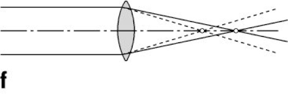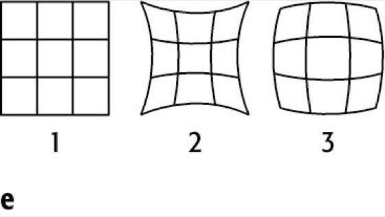 Abbildungsfehler: Die fünf monochromatischen Abbildungsfehler (a Öffnungsfehler, b Koma, c Astigmatismus, d Bildfeldwölbung, e Verzeichnung: Gegenstand (Quadrat 1) wird entweder kissenförmig (2) oder tonnenförmig (3) verzeichnet) und die chromatische Aberration (f, gestrichelte Linie: blaues Licht, durchgezogene: rotes Licht). Die optische Achse ist als strichpunktierte Linie dargestellt.