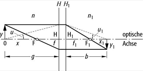Abbildungsgleichungen, bei der geometrisch-optischen Abbildung für das paraxiale Gebiet geltende Beziehungen zwischen konjugierten Größen in Objekt- und Bildraum (Objektweite, Bildweite, Maßstäbe der Abbildungen, usw.). Das abbildende System wird hierbei durch seine Hauptpunkte (Kardinalelemente) H und H1 als Bezugspunkte der Bestimmung der Brennweiten sowie der Objekt- und Bildweiten ersetzt. Zur eindeutigen Angabe von Lage und Größe von Objekt und Bild wird konventionell die Lichtrichtung von links nach rechts angenommen, und die Strecken bezüglich der Lichtrichtung bzw. optischen Achse werden durch entsprechende Vorzeichen gekennzeichnet.