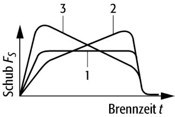 Abbrand: Schub-Zeit-Diagramm (1 neutraler Abbrand, 2 progressiver Abbrand, 3 regressiver Abbrand).