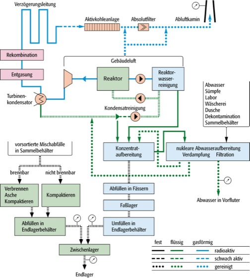 Daneben fallen aber durch Leckagen und Neutronenaktivierung gasförmige, flüssige und feste Reaktorbetriebsabfälle an, die soweit wie möglich zurückgehalten werden. Einige der wichtigsten gasförmigen Radionuklide, die sich in der Luft des Kraftwerksgebäudes befinden, sind die durch Leckage entwichenen Spaltprodukte 133Xe, 85Kr und 131I. 133Xe hat eine Halbwertszeit von 5,25d. Es wird in einer Verzögerungsstrecke bis zu 60d zurückgehalten, so daß die ursprüngliche Aktivität auf weniger als 0,1% abgeklungen ist. Verzögerungsstrecken bestehen z.B. aus Aktivkohlefiltern, in denen sich das radioaktive Gas zunächst anlagert, um sich dann im Laufe der Zeit langsam durch Austausch zum Abluftkamin zu bewegen. Das Spaltprodukt 85Kr hat eine Halbwertszeit von 10,76 a und geht als Edelgas keine Verbindungen ein. Da es sich im Organismus nicht anreichert und demnach nur eine geringe Radiotoxizität (strahlenbedingte Gefährlichkeit) besitzt, wird es in den genehmigten Mengen unter laufender Kontrolle in die Atmosphäre geleitet. Der größte Teil des Kr wird bei der Wiederaufarbeitung der Brennelemente frei und durch besondere Verfahren zurückgehalten (Lagerung in Gasflaschen). Der Anteil an 131I in der Gebäudeluft ist zwar gering; da es aber zu den physiologisch bedeutsamen Elementen gehört, wird es durch mehrere hintereinander angeordnete Absolutfilter zurückgehalten. Aus Undichtigkeiten des Kühlmittelkreises ergeben sich auch flüssige Abfälle, deren radioaktive Stoffe durch Eindampfen entzogen werden.