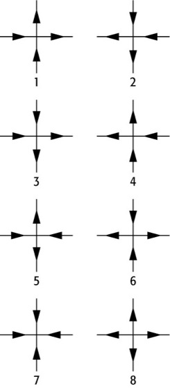 Acht-Vertex-Modell: Die acht möglichen Konfigurationen im Rahmen des Acht-Vertex-Modells.