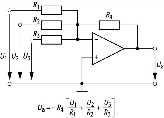 Addierer, eine Schaltung mit einem Operationsverstärker zur Addition von analogen Spannungen, die aus einem invertierenden Verstärker mit mehreren Eingängen besteht. Für die Ausgangsspannung Ua eines Addierers mit drei Eingängen gilt: