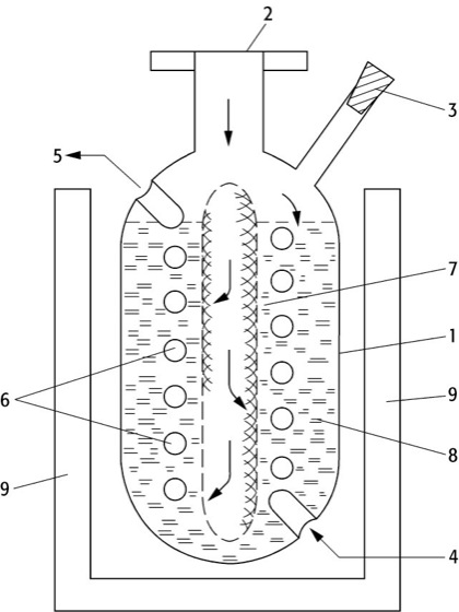 Adsorptionspumpe: Schema einer einfachen Adsorptionspumpe, 1: Pumpengefäß aus Edelstahl, 2: Anschlußflansch (Saugstutzen), 3: Sicherheitsstopfen oder Entlüftungsventil, 4: Kühlmitteleingang, 5: Kühlmittelausgang, 6: Kühlschlange, 7: Siebrohr, 8: Adsorptionsmittel (Aktivkohle oder Zeolith), 9: Kühlmittelbehälter (Dewar). Die Pfeile zeigen den durch die Adsorption angetriebenen Gasstrom an.