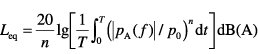 äquivalenter Dauerschallpegel, Leq, eine weit verbreitete Größe zur Kennzeichnung lang andauernder, zeitlich veränderlicher Lärmsituationen. Grundlage ist der Mittelwert des in der Frequenz mit der A-Bewertung und in der Amplitude mit dem Exponenten n bewerteten SchalldruckespA in der Meßzeit T nach folgender Vorschrift: