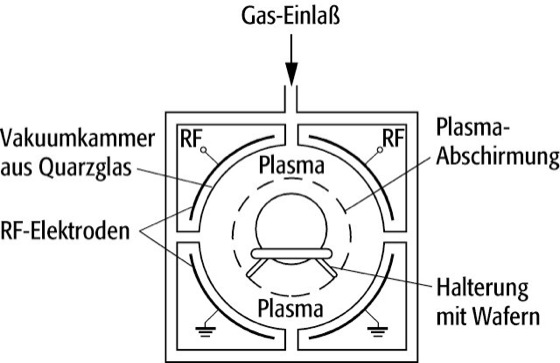 Ätzverfahren, in der Mikrosystemtechnik alle Verfahren, mit denen Strukturen auf Oberflächen (z.B. Silicium-Wafer, Wafer) aufgeätzt werden. Man unerscheidet zwischen naßchemischen Ätzverfahren und physikalischen, trockenen Ätzverfahren. Bei den naßchemischen Verfahren werden die Oberflächen mit einer nichtreaktiven Maske bedeckt und in eine ätzende Lösung getaucht. Besonders bei Strukturen, die kleiner sind als 2 μm, wendet man trockene Verfahren an, wobei sich die Oberflächen in einer verdünnten Gasatmosphäre befinden und mit Ionen beschossen werden. Trockene Verfahren lassen sich wiederum in mehrere Gruppen unterteilen, die zumeist chemische und physikalische Prozesse verbinden. Beim Plasmaätzen beruht die Ätzung auf der chemischen Reaktionen freier, in der Gasentladung erzeugter Radikale, beispielsweise Fluorradikale. Beim Barrelätzen befinden sich die Oberflächen in einem röhrenformigen Behälter und sind durch einen gelochten Zylinder (den sogenannten Ätztunnel) von der Plasmaentladung abgeschirmt (Abb.). Neutrale Radikale können jedoch eintreten und bewirken eine chemische Ätzung auf der Oberfläche. Beim reaktiven Ionenätzen werden mehrere Ionensorten erzeugt, die durch ein elektrisches Feld auf die Oberfläche gelenkt werden und dort gleichzeitig die Ätzung vornehmen. Beim Sputterätzen werden Ionen in der Gasentladung erzeugt und direkt auf die Oberfläche beschleunigt. Hier bewirkt das Einschlagen der Ionen die Zerstäubung der Oberfläche. Beim Ionenstrahlätzen sind schließlich die Oberflächen und die Gasentladung räumlich getrennt. Die Ionen diffundieren zu einem Hochspannungsfeld, in dem sie auf die Oberflächen beschleunigt werden. Bei Verlassen des Feldes werden die Ionen gleichzeitig neutralisiert, um eine Aufweitung des Strahls zu vermeiden. In der genannten Reihenfolge bilden die Ätztechniken einen kontinuierlichen Übergang im Ätzverhalten von isotrop zu anisotrop.
