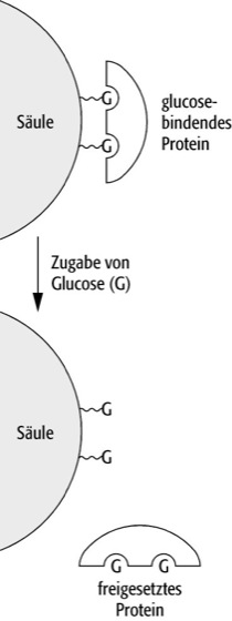 Affinitätschromatographie: Das Protein Concavalin A bindet spezifisch an kovalent gebundene Glucosereste der Säule. Nach dem Herauswaschen anderer Proteine wird das Concavalin durch Glucosemoleküle in der Lösung von der Säule verdrängt und als reines Protein eluiert.