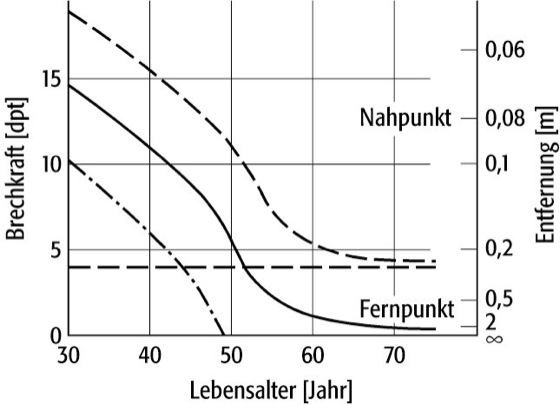 Akkommodation: Akkommodationswerte als Funktion des Lebensalters für kurz- ( – – – ), weit- ( – · – ) und normalsichtige (--) Personen.