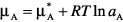 das chemische Potential bzw. der Dampfdruck des reinen Lösungsmittels und pA bzw. μA der Dampfdruck bzw. das chemische Potential des gelösten Stoffs. Aus dem Dampfdruck pA der Lösung läßt sich die Aktivität aA des Lösungsmittels berechnen. Das chemische Potential μB des gelösten Stoffs B lautet
