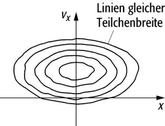 Die Akzeptanz ist ein Maß für die Leistungsfähigkeit des fokussierenden Systems; sie kann in Form einer begrenzten Fläche im Phasenraumdiagramm dargestellt werden (Abb.). Teilchenstahlen, die als räumlich ausgedehnte Wolke am Eingang des Systems eintreffen und zudem unterschiedliche Geschwindigkeiten besitzen, füllen einen kreisförmigen bzw. elliptischen Bereich des Phasenraums.