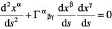 Darin werden die Komponenten Γαβγ der Christoffel-Konnexion mit den auftretenden Trägheitskräften identifiziert, und die Komponenten gαβ der Metrik mit den entsprechenden Trägheitspotentialen. Nach der Einsteinschen Summenkonvention wird in dieser Gleichung wie auch im folgenden über zwei gleiche Indizes summiert. Die lokale Gleichsetzung von Gravitationskräften mit Trägheitskräften durch das Äquivalenzprinzip führt unmittelbar zu den folgenden Grundideen der Allgemeinen Relativitätstheorie: Gravitationspotentiale bzw. -kräfte werden mit der Metrik bzw. mit der Christoffel-Konnexion identifiziert. Lokal ergibt sich die (flache) Geometrie der Speziellen Relativitätstheorie: die Tangentialräume an jedem Punkt der Raumzeitmannigfaltigkeit sind Minkowski-Räume. In endlichen Gebieten kann die Gravitation allerdings nicht durch Transformation auf ein frei fallendes Bezugssystem "wegtransformiert" werden. Das bedeutet mathematisch, daß die Christoffel-Konnexion in Anwesenheit von Gravitationsfeldern im allgemeinen nicht integrabel ist. Somit verschwindet der entsprechende Riemannsche Krümmungstensor Rαβγδ – im Unterschied zur Speziellen Relativitätstheorie – nicht mehr: die speziell-relativistische Minkowski-Geometrie wird in der Allgemeinen Relativitätstheorie von einer Riemannschen Geometrie der Raumzeit abgelöst.