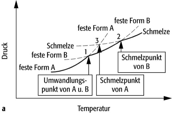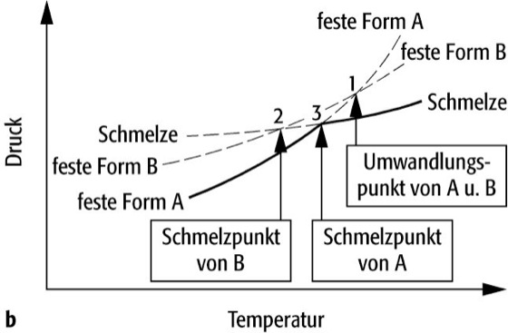 Allotropie: a) Dampfdruckkurven enantiotroper Modifikationen. Der Schnittpunkt der Dampfdruckkurven der beiden festen Modifikationen A und B entspricht dem Umwandlungspunkt, bei dem beide Formen nebeneinander existieren können (gleicher Dampfdruck); b) Dampfdruckkurven monotroper Modifikationen. Der Umwandlungspunkt der beiden festen Modifikationen liegt oberhalb der Schmelztemperatur, weshalb die beiden Formen nicht nebeneinander existieren können.