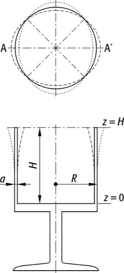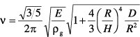 wobei der erste Wurzelfaktor die Abhängigkeit von den Materialeigenschaften (Elastizitätsmodul E und Dichte ρg) enthält, und die anderen Funktionen die Abhängigkeit von geometrischen Eigenschaften (Radius R, Höhe H und Wanddicke D des Glases); dabei rührt der Faktor D/R2 von der horizontalen Verbiegung her, und die zweite Wurzel stellt einen Korrekturfaktor für die zusätzliche vertikale Verbiegung dar. Für ein mit der Flüssigkeit der Dichte ρf bis zur Höhe H ′ gefülltes Glas ist ν durch eine näherungsweise zu