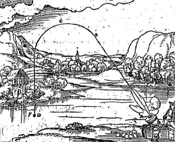 : Geschwindigkeit des Balles, k: Reibungskonstante, g: Erdbeschleunigung). Das Ergebnis erinnert sehr an die mittelalterliche Darstellung von ballistischen Kurven ( Abb. 8 ).