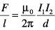 fließen (μ0 magnetische Feldkonstante, l Länge des Leiters); für I1 = I2 = 1A, d = 1m, F/l = 2 · 10-7Nm-1 ergibt sich die gleichwertige Darstellung