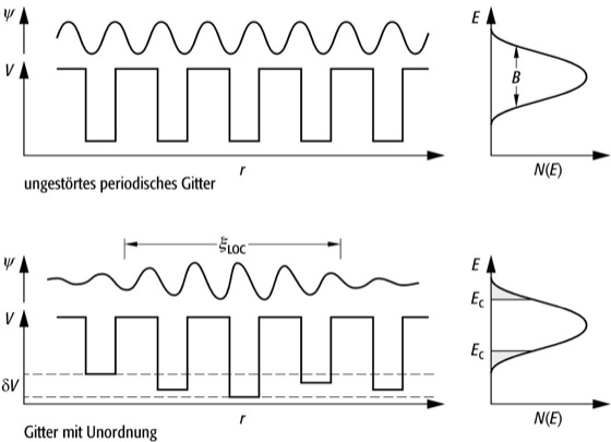 Anderson-Lokalisierung: Oben ein ungestörtes periodisches Gitter, unten Auftreten der Anderson-Lokalisierung bei Gitterunordnung: V: Potential, ψ: Wellenfunktion der Elektronen, r: Abstand, ξLOC: Kohärenzlänge, E: Energie, N(E): Energieverteilung, EC: Mobilitätskanten.