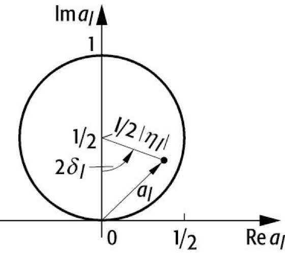 Argand-Diagramm: Streuamplitude al dargestellt als Vektor in der komplexen Ebene. δl ist die Phasenänderung der l-ten Partialwelle, und nl ist ihre Amplitude. Aufgrund des Kausalitätsprinzips muß mit steigender Energie der Vektor den Kreis entgegen dem Uhrzeigersinn durchlaufen.