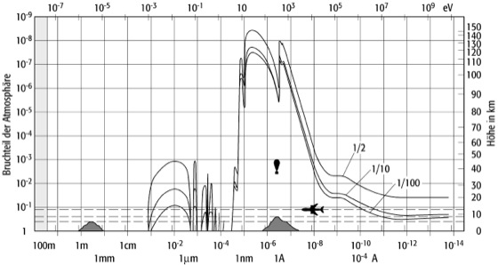 astronomisches Fenster: Die Durchlässigkeit der Erdatmosphäre für elektromagnetische Strahlung. Die drei Kurven markieren den Bereich der Erdatmosphäre, die jeweils noch 1/2, 1/10 und 1/100 der einfallenden Strahlungsintensität durchlassen. Die rechte Ordinate gibt die Höhe über dem Erdboden an. Die ungefähre Höhe, die mit Ballon und Flugzeug erreicht werden kann, die Höhe des Mount-Everest und des Chacaltaya auf Hawaii sind ebenfalls markiert.