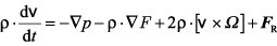 (dies ist die um einen Reibungsterm erweiterte Eulersche Gleichung für ein inkompressibles Fluid in einem rotierenden Bezugssystem, Navier-Stokes-Gleichung). Dabei bezeichnet