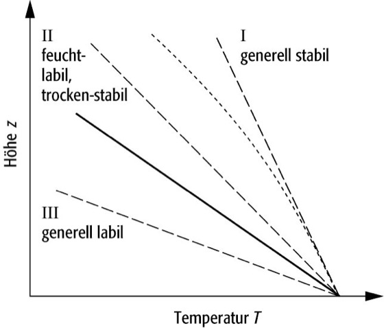 Atmosphärische Schichtung: Schichtungsstabilität von Luftmassen mit unterschiedlichen vertikalen Temperaturgradienten dT/dz (gestrichelte Linien I, II, III). Die durchgezogene Linie stellt den trockenadiabatischen Temperaturgradienten dar, die punktierte Linie den feuchtadiabatischen.