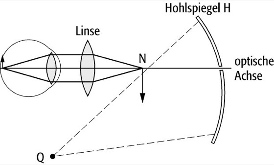 Augenspiegel: Das Licht der Quelle Q gelangt über den Hohlspiegel H in den hinteren Teil des Auges, der über die beiden Linsen als reelles Bild N außerhalb des Auges abgebildet wird.