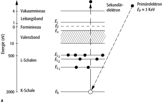 Auger-Effekt 2: Schematische Darstellung des Auger-Prozesses. a) Ionisierung durch Beschuß mit Primärelektronen; b) Emission eines KLL-Auger-Elektrons.