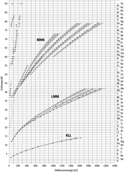 Auger-Elektronenspektroskopie 2: Übersicht über die Energien der wichtigsten Auger-Linien.