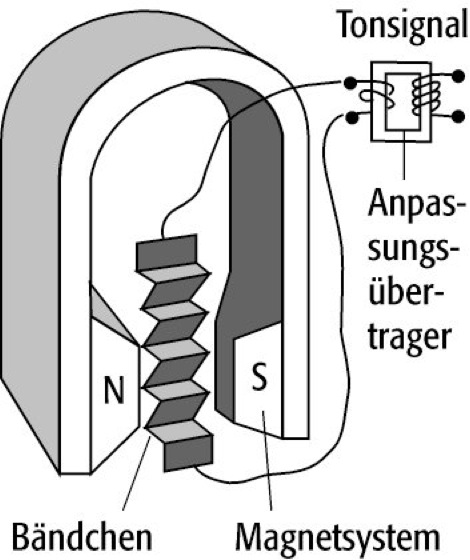 Bändchenmikrophon, Bauform des dynamischen Mikrophons (Mikrophon). Das Bändchenmikrophon wurde 1909 von F.E. Simon erfunden und von W. Schottky und W. Gerlach verbessert, ab 1928 wurde es in Serie gefertigt. Zwischen den Polen eines starken Dauermagneten ist als Membran ein geriffeltes Metallbändchen gespannt. Wenn das Bändchen dem Schallfeld ausgesetzt ist, sind seine Bewegungen im Magnetfeld dem Druckgradienten proportional und es wird eine Wechselspannung induziert. Das Bändchenmikrophon ist äußerst niederohmig. Daher ist ein Anpassungstransformator erforderlich. Wegen seiner hohen Tonqualität wurde das Bändchenmikrophon für Aufnahmen bei Rundfunk, Schallplatte und Film eingesetzt.