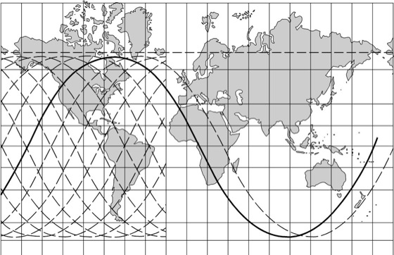 Bahnabwicklung, Bahnprojektion, Kurvenbild, das sich für die Bahn eines künstlichen Raumflugkörpers bei der Projektion auf eine Weltkarte ergibt. Die Bahn eines Satelliten, die in erster Näherung als raumstabil betrachtet werden kann, wird in dieser Darstellung als wellenförmiger Kurvenzug auf der unter ihr hinwegrotierenden Erdoberfläche abgebildet. Je größer die Bahnneigung (Inklination) eines Raumflugkörpers, um so größer sind die Amplituden des symmetrisch zum Erdäquator verlaufenden Kurvenzugs und folglich auch der Anteil der überflogenen Erdoberfläche. Die "Wellenlänge" wird dagegen durch die Umlaufszeit oder auch die mittlere Bahnhöhe eines Satelliten festgelegt, denn je niedriger diese ausfällt, um so enger folgen die Wellenzüge aufeinander. In fast allen großen Raumflugkontrollzentren wird die Bahnabwicklung während einer Mission auf einer großen Projektionswand dargestellt, um so die Bewegungen eines Raumflugkörpers in Bezug auf die Erdoberfläche ständig überwachen zu können.
