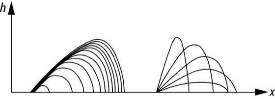 ballistischer Flug: ballistische Flugbahnen (h = erreichte Höhe, z = erreichte Weite der Flugkörper) in Abhängigkeit von der Anfangsgeschwindigkeit
