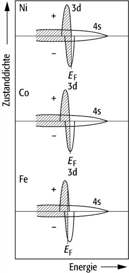 Bandmagnetismus: Bandstrukturen der ferromagnetischen Metalle Fe, Co, Ni (schematisch).
