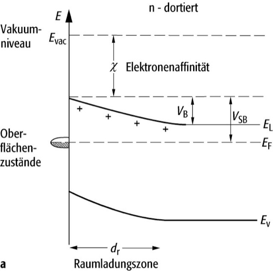 Bandverbiegung, die Differenz zwischen der energetischen Lage der Leitungsbandkante an der Festkörperoberfläche und der im Festkörperinneren (Abb.). Sie ist die Folge eines elektrostatischen Potentials an der Oberfläche oder Grenzfläche eines dotierten Halbleiters. Dieses entsteht, wenn bei n-Dotierung unbesetzte Oberflächen- bzw. Grenzflächenzustände in der Bandlücke vorhanden sind. Sie werden von Elektronen aus energetisch ungünstigeren Zuständen des Leitungsbandes besetzt, was eine negativ geladene Oberfläche, gefolgt von einer positiven Raumladungszone und damit ein Potential hervorruft. Für p-Dotierung gilt eine analoge Erklärung, ausgehend von besetzten Zuständen in der Bandlücke und Löchern im Valenzband. Der Potentialverlauf kann durch die Poisson-Gleichung beschrieben werden. Die Bandverbiegung ist keine intrinsische Größe des Halbleiters, sondern hängt auch von dessen Dotierung ab. Eine dotierungsunabhängige Größe ist dagegen die Schottky-Barriere, die Differenz zwischen Leitungsbandniveau an der Festkörperoberfläche und Fermi-Niveau. In der Halbleiter-Technologie wird die Bandverbiegung z.B. bei der Schottky-Diode ausgenutzt.