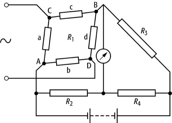 Barretter, eine Brückenschaltung, bei der zwei Ströme sich in ihrer Wirkung beeinflussen, aber elektrisch entkoppelt sind. Ein Beispiel ist die Barretter-Schaltung nach dem Bolometer-Prinzip zur Messung kleiner Wechselströme (Abb.). Dabei bilden vier Heißleiter den Zweig R1 einer Wheatstone-Brücke. Verhalten sich die vier Widerstände a:b = c:d, so können sich der Brückenstrom AB und der Meßstrom CD nicht beeinflussen. Die Änderung des Brückenzweiges R1, die vom Meßstrom hervorgerufen wird, dient als Meßsignal. Die Abhängigkeit von äußeren Temperatureinflüssen kann vermindert weden, wenn R2 und R3 die gleiche Temperaturabhängigkeit wie R1 besitzen.