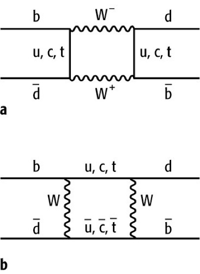 wobei die Mischungen auf Wechselwirkungen beruhen, die sich durch Box-Diagramme darstellen lassen (Abb.). Die Indizes L und H stehen für light (leicht) und heavy (schwer) und bringen zum Ausdruck, daß das System der neutralen B-Mesonen (im Unterschied zu den Kaonen) vor allem durch den Massenunterschied ΔM der beiden Eigenzustände charakterisiert ist, während für die Lebensdauern bzw. Zerfallsbreiten keine Differenz beobachtet werden konnte (theoretisch erwartet man