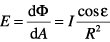 Bestrahlungsstärke, E, die StrahlungsleistungΦ, die auf eine im Abstand R um den Winkel ε gegen die Strahlrichtung geneigte Fläche A pro Flächeneinheit auftrifft: