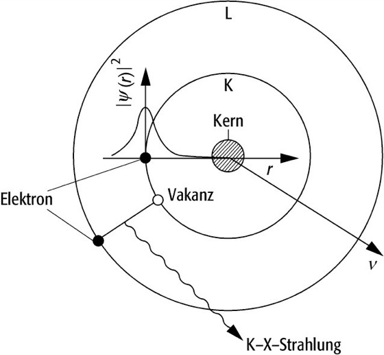 b) Den Einfang eines Elektrons aus der K-Schale der Atomhülle in den Kern konnte L. Alvarez 1938 nachweisen. Beim Elektroneneinfang tritt ein Proton eines protonenreichen Kerns mit einem Hüllenelektron der K-, L- oder M-Schale in Wechselwirkung; dabei bilden sich ein Neutron und ein Neutrino (Abb. 2). Analog zum β + -Zerfall ändert sich der Kern gemäß