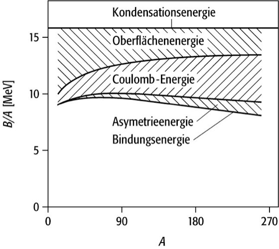 1) Hauptbeitrag zur Bindungsenergie ist die Kondensations- oder Volumenenergie, die frei wird, wenn sich die Nukleonen zum Kern vereinen. Dieser Anteil ist durch B1 = aVA gegeben, wobei A die zum Kernvolumen proportionale Anzahl der Nukleonen beschreibt und aV eine Konstante ist.
