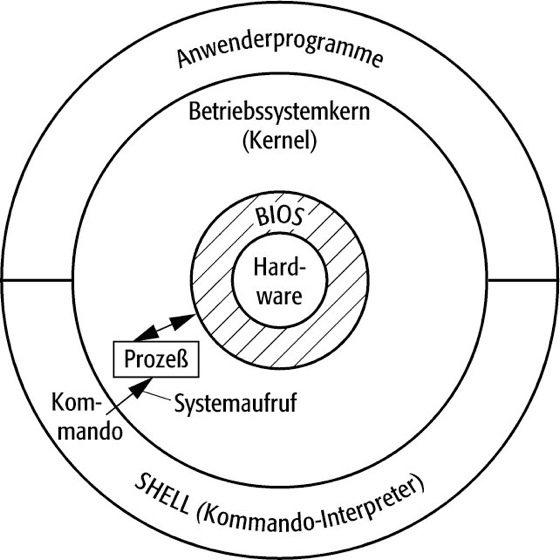 Betriebssystem, Operations-System, OS, Programm, das grundlegende Funktionen eines Computers wie Ein/Ausgabe-Operationen, Speicherverwaltung, Dateiverwaltung und Datenmanipulation, Programmablaufsteuerung usw. regelt. Es schirmt den Anwender/Programmierer von der nackten Hardware ab und stellt ihm einen Befehlssatz zu Verfügung, der es ermöglicht, alle wesentlichen Funktionen des Computers verständlich zu handhaben bzw. zu programmieren. Der Aufbau eines Betriebssystems läßt sich am einfachsten im Schalenmodell (Abb.) verstehen. Die erste Schale um die Hardware ist das BIOS (Basic Input Output System), es enthält die wesentlichen Treiber für die elementare Peripherie (u.a. Tastatur, Bildschirm, Speichermedium). Das BIOS befindet sich als Firmware im Festwertspeicher (ROM) des Computers. Der sog. Kernel ist das eigentliche Betriebssystem (Betriebssystem-Kern), er liegt über dem hardwarenahen BIOS. Der Kernel stellt eine Sammlung von ausführbaren Programmen dar und greift auf die Routinen des BIOS zu. Der Kernel wird wiederum von den Programmen der darüberliegenden Schicht (Shell, Kommandointerpreter) genutzt. Verbreitete Betriebssysteme sind z.B. MS-DOS, Windows NT, UNIX, VMS und für VME-BussystemeOS9.