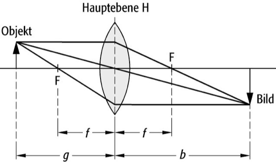 Bildkonstruktion, bei abbildenden optischen Systemen die geometrische Konstruktion der Lage eines Bildes nur anhand der Brennweitef und der Objektweite g. Die Bildkonstruktion kann mit zwei der insgesamt drei ausgezeichneten Strahlen (Paraxialstrahlen) durchgeführt werden, die sich jeweils im Objekt- und Bildpunkt schneiden: 1. dem Parallelstrahl, der nach der Brechung durch den bildseitigen BrennpunktF geht, 2. dem Mittelpunktsstrahl, der die Linse ungebrochen durchdringt, und 3. dem Brennpunktsstrahl, der durch den objektseitigen Brennpunkt läuft und nach der Brechung parallel zur optischen Achse verläuft. Als Beispiel sei die Brechung an der Oberfläche einer dünnen Sammellinse gezeigt, die näherungsweise mit Hilfe der Hauptebene H beschrieben werden kann (Abb.). Für die Bildkonstruktion bei einer dicken Linse müssen zwei Hauptebenen eingeführt werden, zwischen denen die Strahlen parallel zur optischen Achse verlaufen.